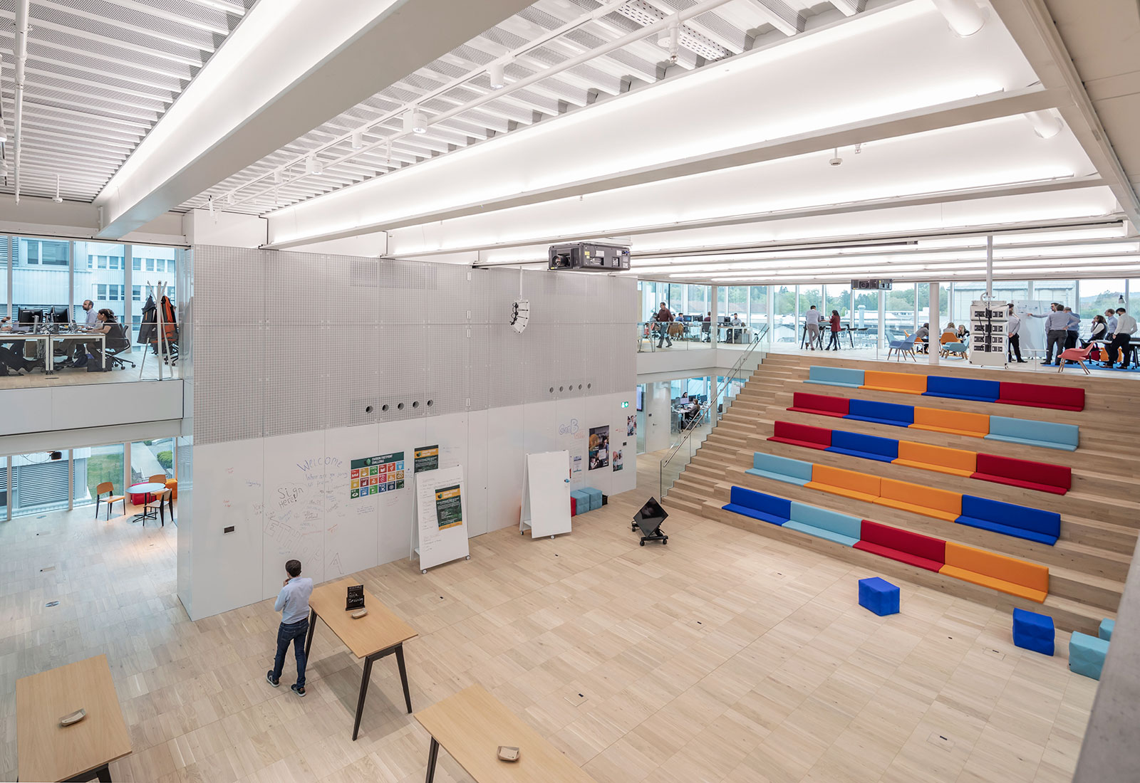 Umgenutzte Seecontainer, loungeartige Möbel und flexibel nutzbare Arbeitsplätze schaffen eine lockere Atmosphäre und brechen mit der Konvention des klassischen Bürobaus hin zu einem Coworking Space, einem Ort des kollaborativen Forschens und Entwickelns. Auf drei Ebenen beherbergt das Gebäude die Projektteams von Mitarbeitenden, Startups sowie von Studierenden und Lernenden. Neben spannenden räumlichen Strukturen gelingt dem Gebäude eine intelligente Synthese von Flexibilität und einer mit dem Leed Gold Label zertifizierten Nachhaltigkeit. Hinter der industriell anmutenden Atmosphäre, welche durch die unbekleidete Stahlkonstruktion hervorgerufen wird, versteckt sich eine innovative Haustechnik sowie eine smarte Gebäudeautomation. Das tragende Trapezblech der Decken erfüllt raumakustische Funktionen und beherbergt das gesamte Heiz- und Kühlsystem.