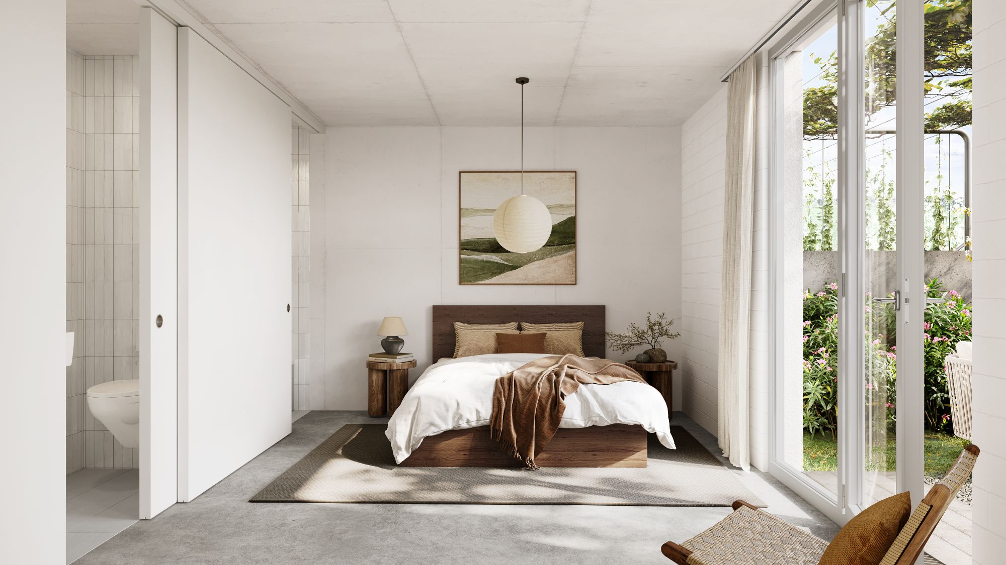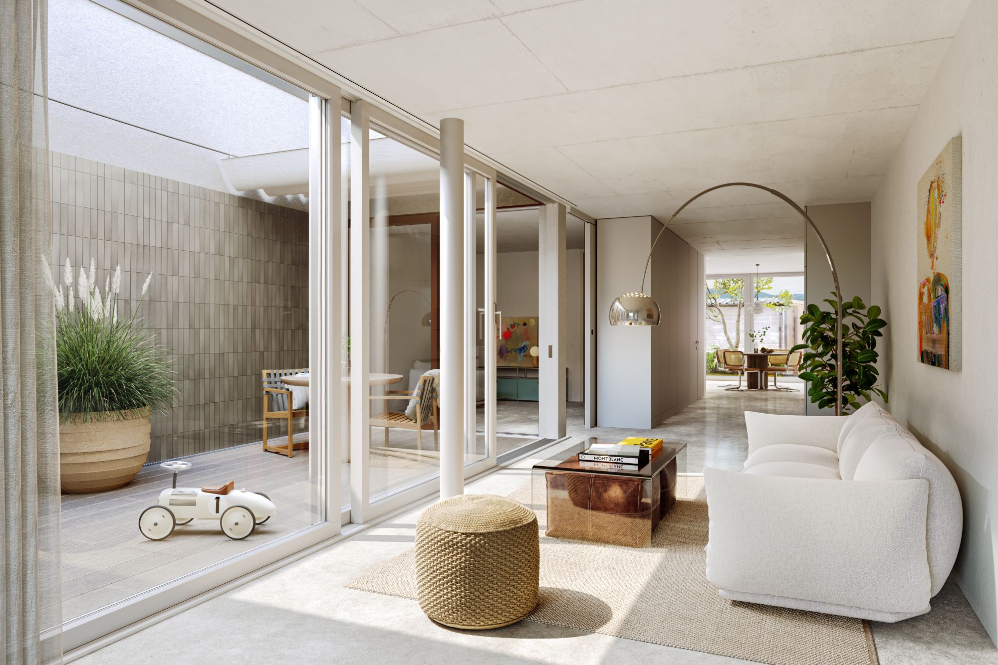 Das anmutige Projekt umfasst zwei sorgfältig konzipierte Gebäude, die sich harmonisch in die Umgebung einfügen und zum Verweilen einladen. Die Wohnungen im Erdgeschoss verzaubern mit ihrer Hoftypologie: ein sich nach Westen öffnender Vorhof als privater Wohnungszugang, ein Vorgarten im Süden mit schattenspendender Pergola und ein innenliegender Patio mit viel Zenitallicht für die innenliegenden Wohnräume. Darüber befinden sich drei weitere Geschosse – erschlossen mit charmanten Laubengängen. Die Kleinwohnungen im 1. Obergeschoss überraschen mit je einer überaus grosszügigen privaten Terrasse und die darüber liegenden Maisonettewohnungen setzen mit ihren jeweiligen Aussenterrassen neue Massstäbe für offenes Wohnen. Als Verbindung dient je eine mittig angelegte Plattform im 1. und 3. Obergeschoss, die zu Laubengängen führt. Einheimische Bäume und Sträucher runden den Aussenbereich ab und machen die Solistrasse 68 zur neuen Wohlfühloase in Bülach.