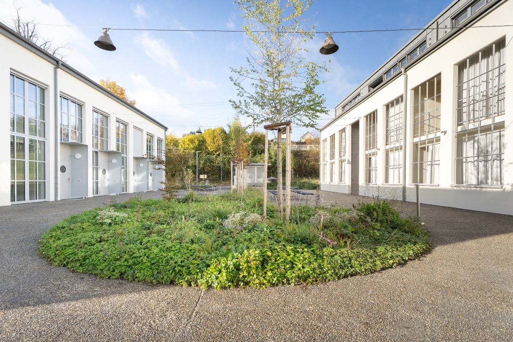 Die Gebäude aus den 50er- und 60er-Jahren wurden bis auf die beiden ursprünglichen Werkhallen rückgebaut. Das spart zum einen CO2-Emmissionen, da für die bereits bestehenden Untergeschosse und Hüllen kein zusätzlicher Beton benötigt wird. Zum anderen wird der Charme des früheren Industriebetriebs eingefangen.